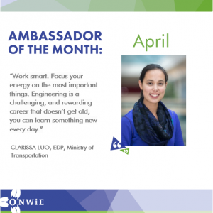 Clarissa Luo is our Ambassador of the Month for April 2019! Clarissa studied civil engineering at Western University, and currently works as an EDP (Engineer in Training) for the Ministry of Transportation – Ontario.